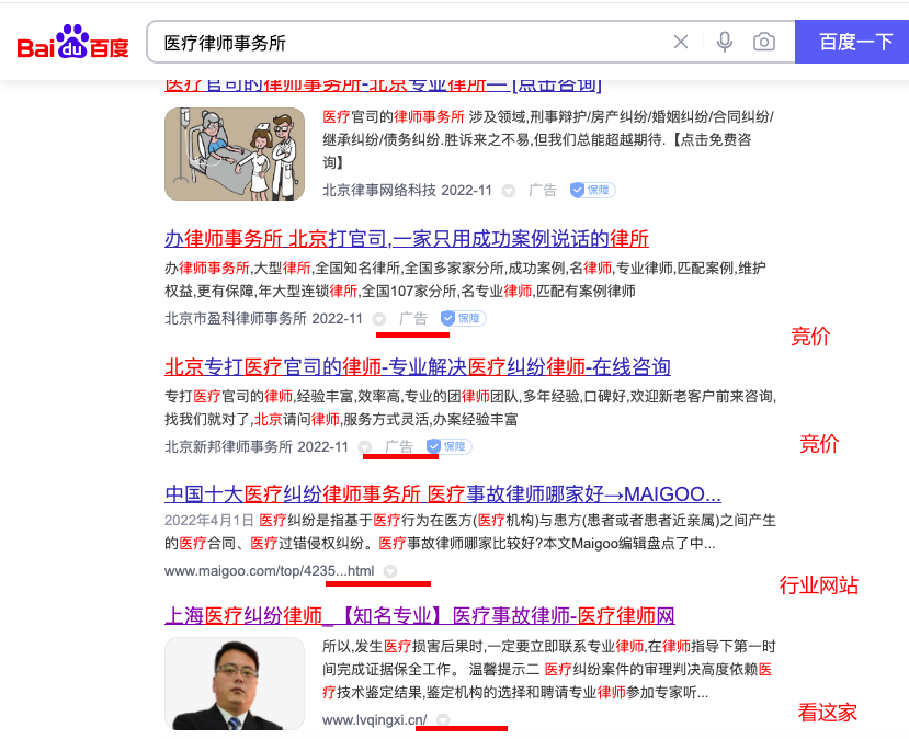 比如我们拿(ná)律师行业举例,律师有(yǒu)刑事案件、民(mín)事案件、医疗案件等等。我在百度搜索医疗律师事務(wù)所。前面这些带广告的不要看,他(tā)们是做了竞价排名。